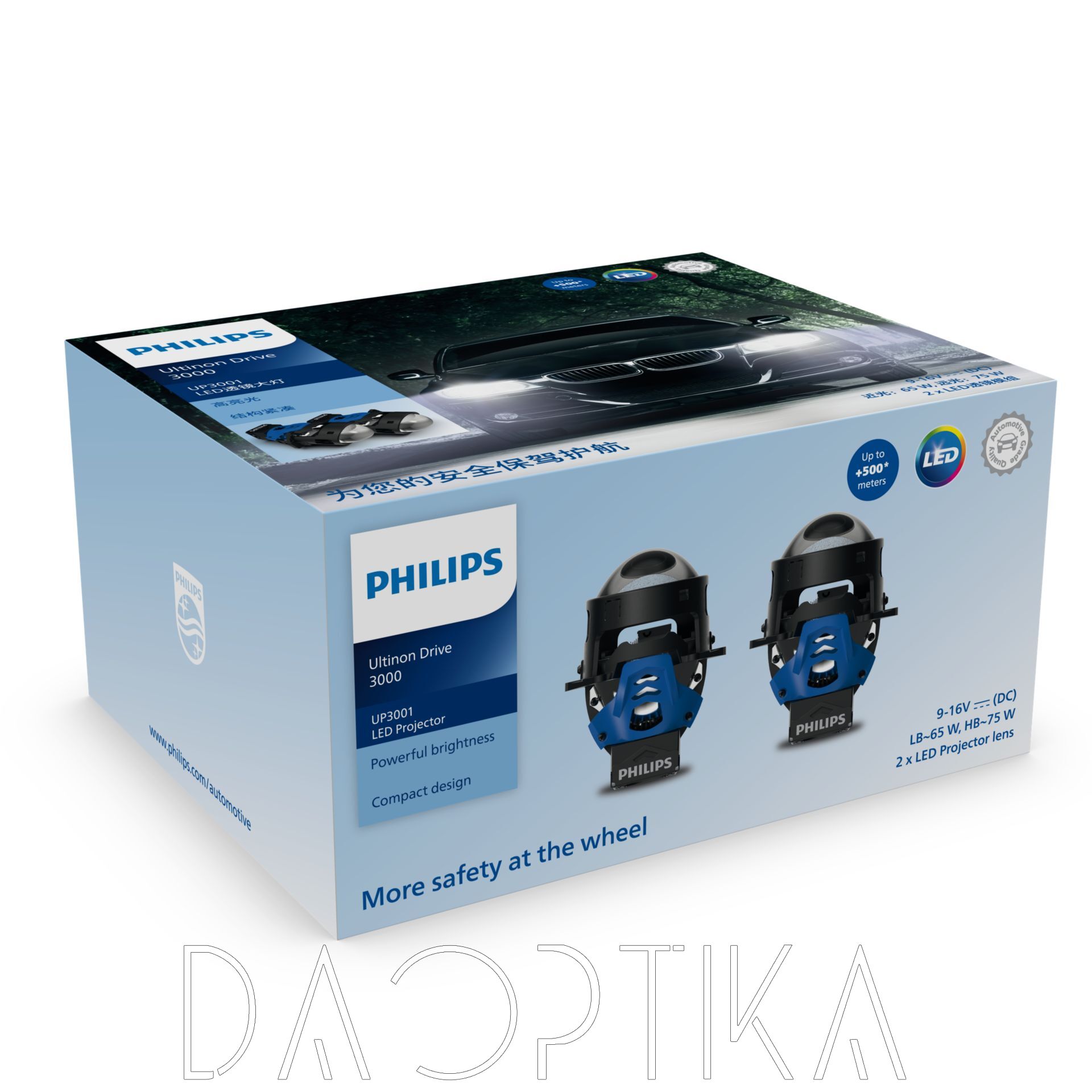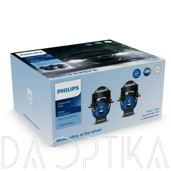| Благодаря мощности до 75 Вт и увеличенной на 400% яркости, эти фары улучшают видимость на дороге. Чем шире поле зрения, тем лучше вы можете управлять автомобилем, тем быстрее реагируете и тем безопаснее вы себя чувствуете. Поэтому не оставайтесь в темноте. Выберите светодиодные проекционные фары Philips Ultinon Drive и управляйте автомобилем уверенно и легко ночью. | В светодиодных проекционных фарах Philips Ultinon Drive используется мощная светодиодная технология, протестированная в немецкой автомобильной лаборатории, обеспечивающая исключительную видимость на расстоянии до 500 метров. Яркий, равномерный световой пучок помогает видеть дальше по дороге и по бокам, позволяя быстрее реагировать на потенциальные опасности впереди. | В светодиодных проекционных фарах Philips Ultinon Drive используется мощная светодиодная технология, протестированная в немецкой автомобильной лаборатории, обеспечивающая исключительную видимость на расстоянии до 500 метров. Яркий, равномерный световой пучок помогает видеть дальше по дороге и по бокам, позволяя быстрее реагировать на потенциальные опасности впереди. |