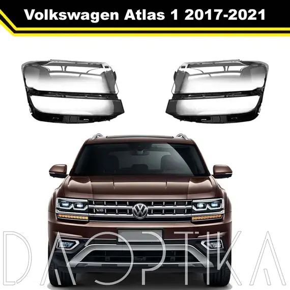 Стекло левой фары из оптического поликарбоната с защитным лаком для замены оригинального стекола фары на Volkswagen Atlas 2017-2021 1 поколение