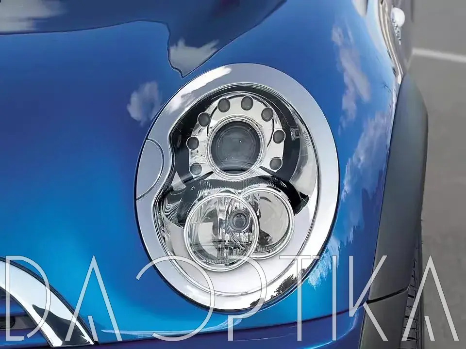 Стекло правой фары из оптического поликарбоната с защитным лаком для замены оригинального стекола фары на Mini Cooper 2000-2006 R50