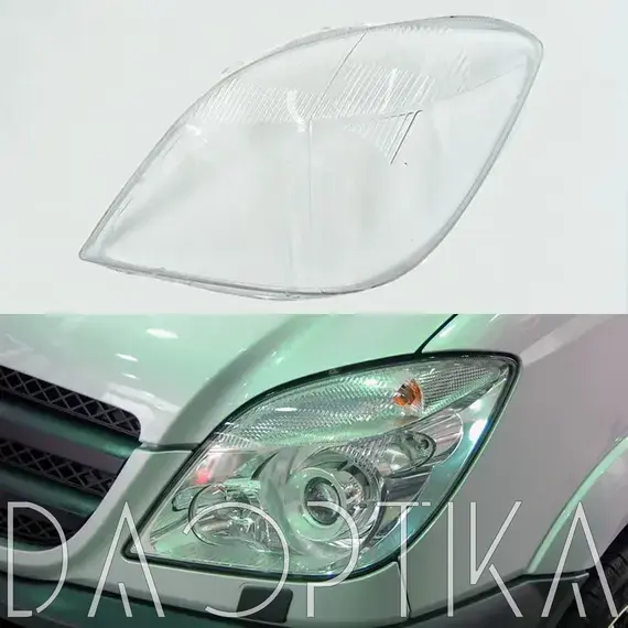 Стекло левой фары из оптического поликарбоната с защитным лаком для замены оригинального стекола фары на Mercedes-Benz Sprinter 2006-2013 W906