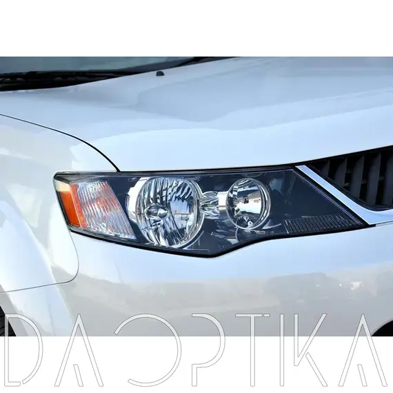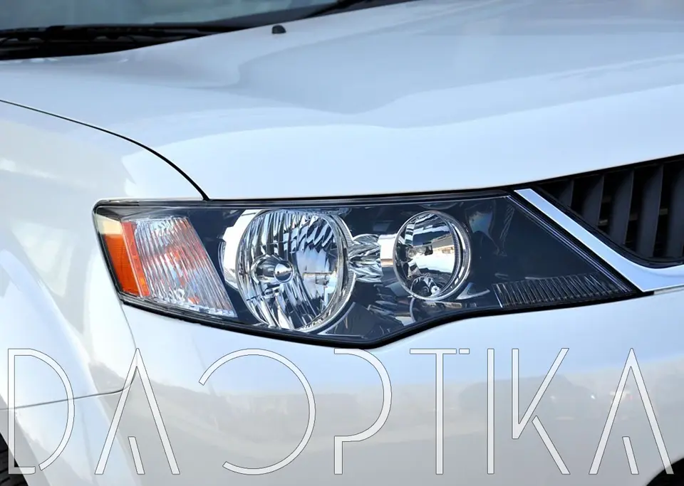 Стекло левой фары из оптического поликарбоната с защитным лаком для замены оригинального стекола фары на Mitsubishi Outlander 2005-2009 XL