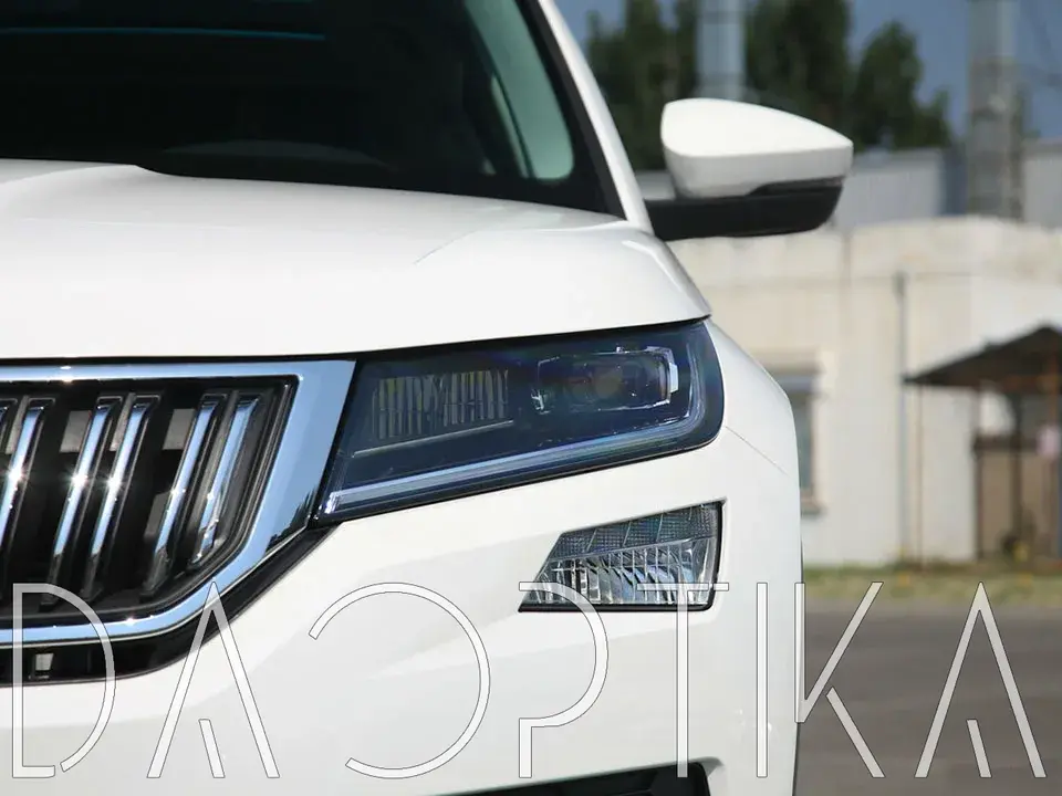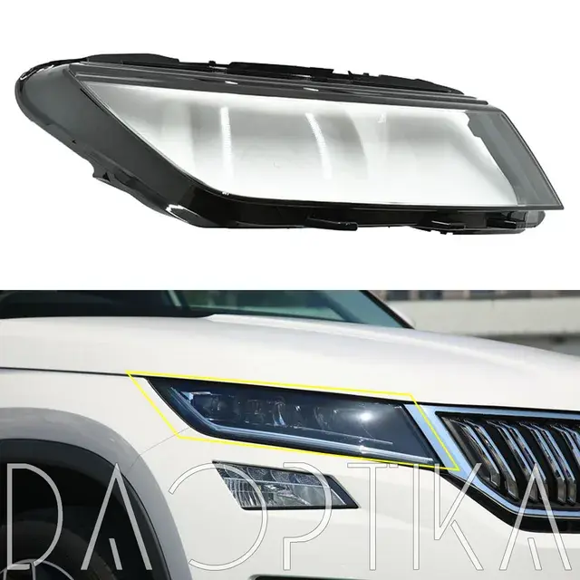 Стекло левой фары из оптического поликарбоната с защитным лаком для замены оригинального стекола фары на Skoda Kodiaq 2016-2022 1 поколение