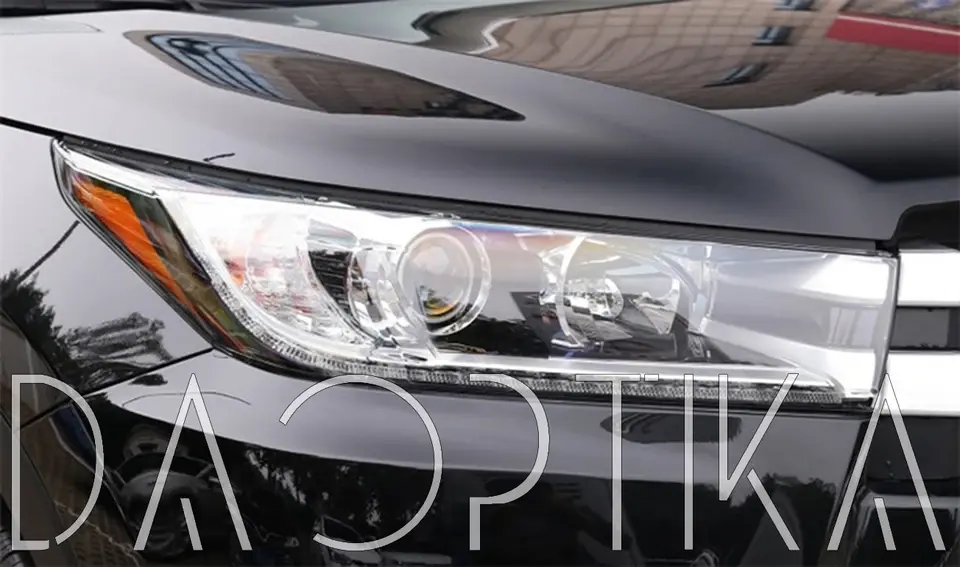 Стекло левой фары из оптического поликарбоната с защитным лаком для замены оригинального стекола фары на Toyota Highlander 2016-2019 U50 3 поколение [рестайлинг]