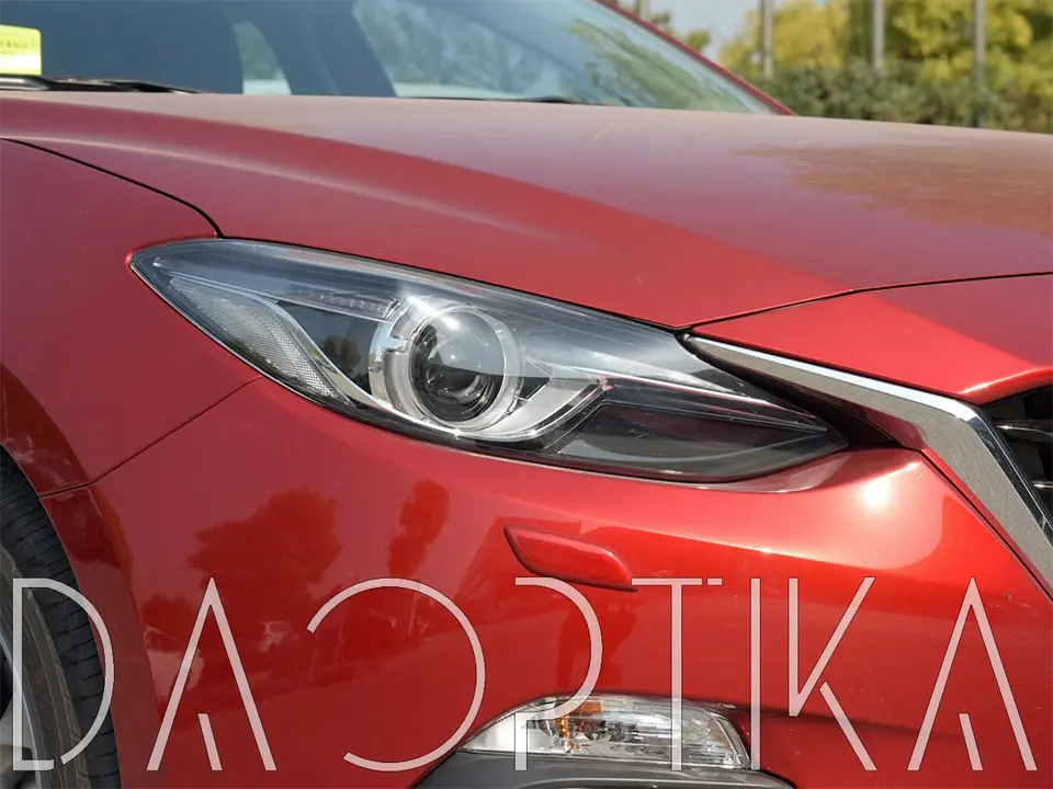 Стекло правой фары из оптического поликарбоната с защитным лаком для замены оригинального стекола фары на Mazda 3 2013-2017 BM