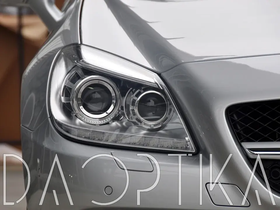 Стекло правой фары из оптического поликарбоната с защитным лаком для замены оригинального стекола фары на Mercedes-Benz SLK-Class 2011-2016 R172