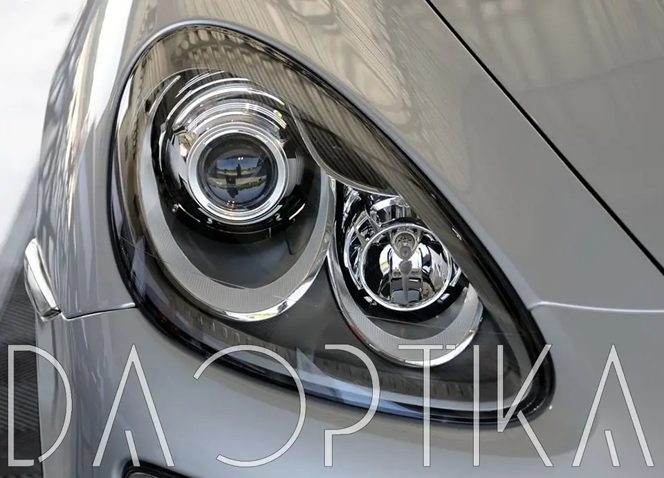 Стекло правой фары из оптического поликарбоната с защитным лаком для замены оригинального стекола фары на Porsche Cayenne 2010-2014 958
