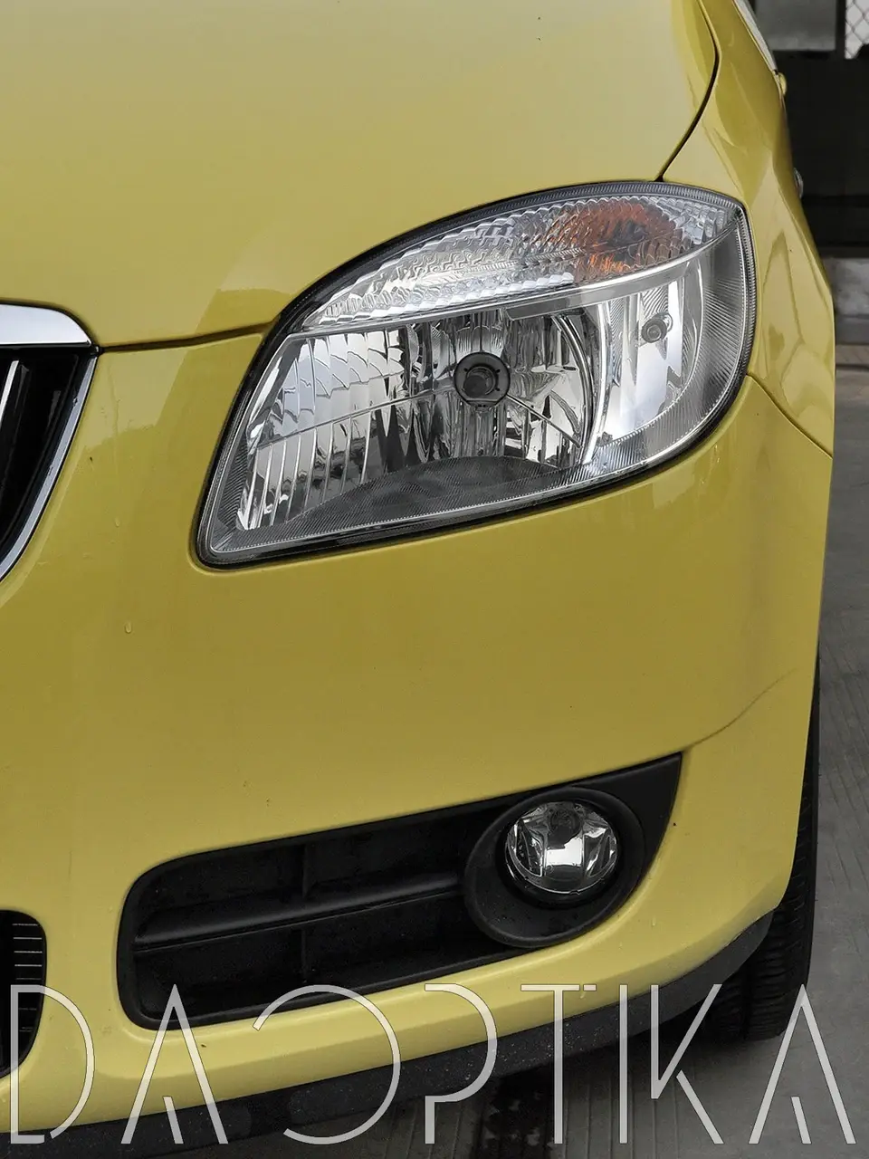 Стекло правой фары из оптического поликарбоната с защитным лаком для замены оригинального стекола фары на Skoda Fabia 2007-2010 5J