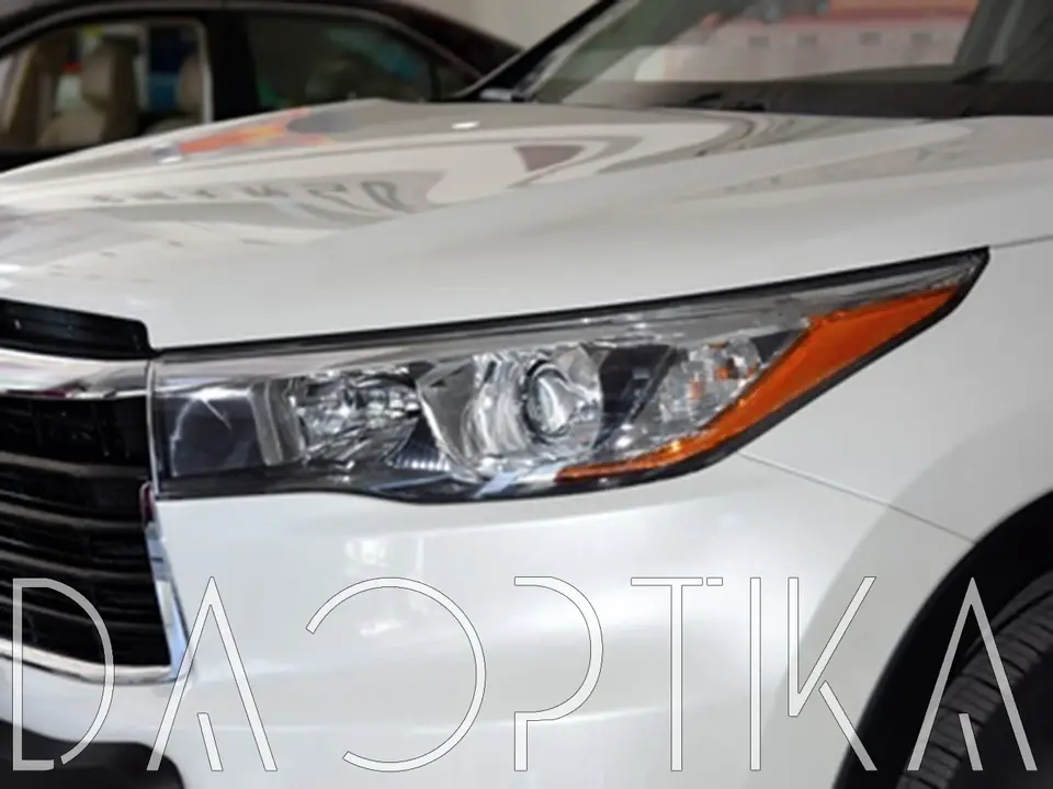 Стекло правой фары из оптического поликарбоната с защитным лаком для замены оригинального стекола фары на Toyota Highlander 2013-2016 U50 3 поколение