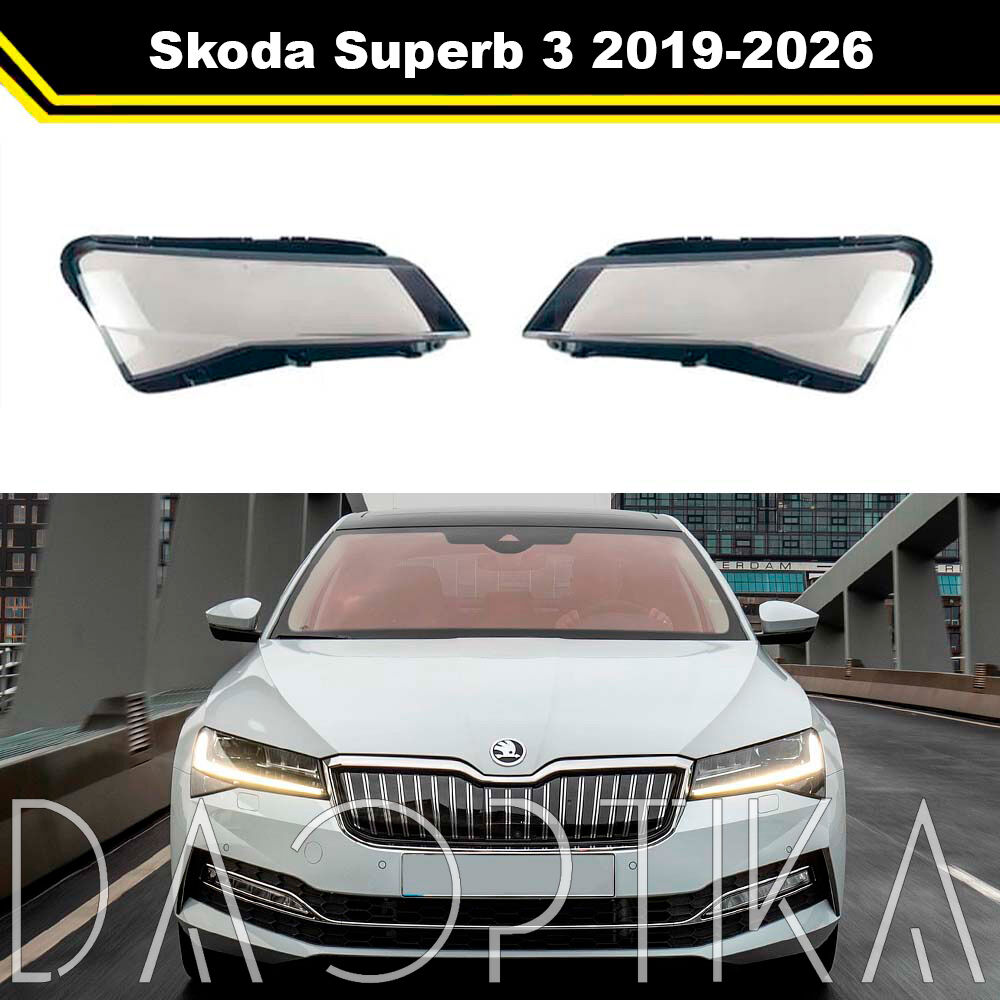 Стекло правой фары из оптического поликарбоната с защитным лаком для замены оригинального стекола фары на Skoda Superb 2019-2026 3 поколение [рестайлинг]