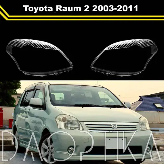Стекло правой фары из оптического поликарбоната с защитным лаком для замены оригинального стекола фары на Toyota Raum 2003-2011 2 поколение